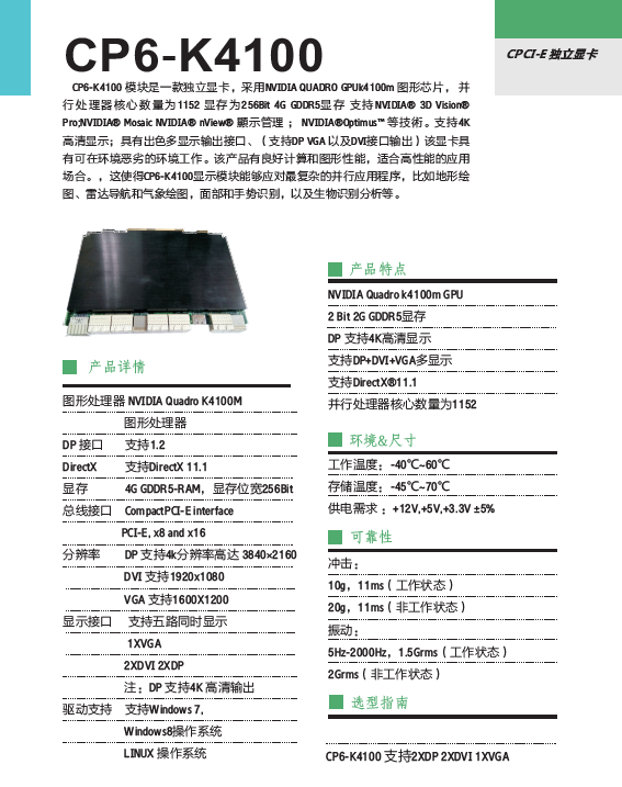CP6-K4100 模塊是一款獨(dú)立顯卡,采用NVIDIA QUADRO GPUk4100m 圖形芯片, 并行處理器核心數(shù)量為1152 顯存為256Bit 4G GDDR5顯存 支持NVIDIA? 3D Vision? Pro;NVIDIA? Mosaic NVIDIA? nView? 顯示管理 ; NVI...