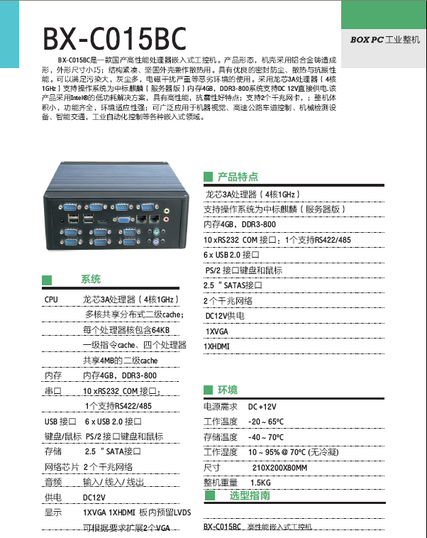 BX-C015BC是一款國產龍芯3A高性能處理器嵌入式BOX PC 工控機。產品形態,機殼采用鋁合金鑄造成形,外形尺寸小巧;結構緊湊、堅固外殼兼作散熱用。具有優良的密封防塵、散熱與抗振性能。可以滿足污染大,灰塵多,...