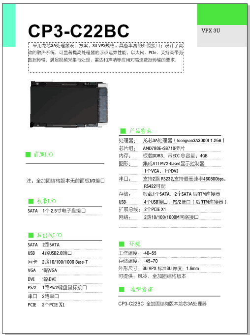 采用龍芯3A處理器設(shè)計方案,3U VPX規(guī)格。具備豐富的外圍接口;設(shè)計了高